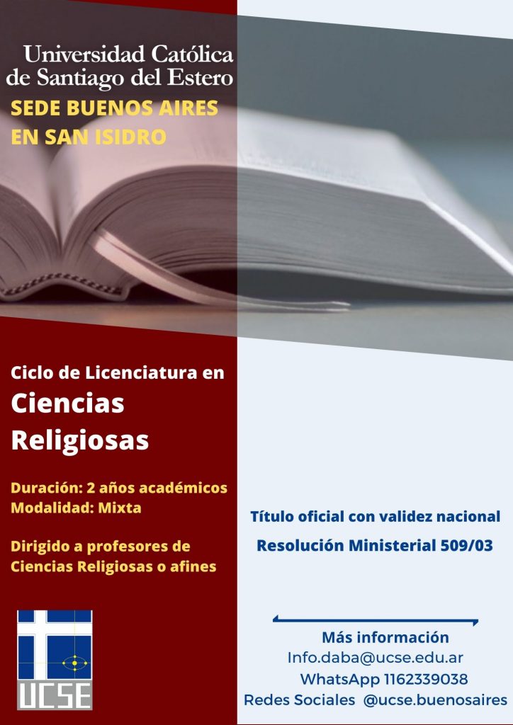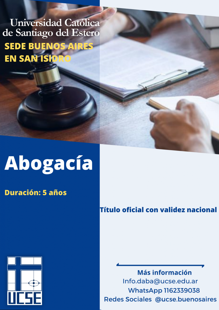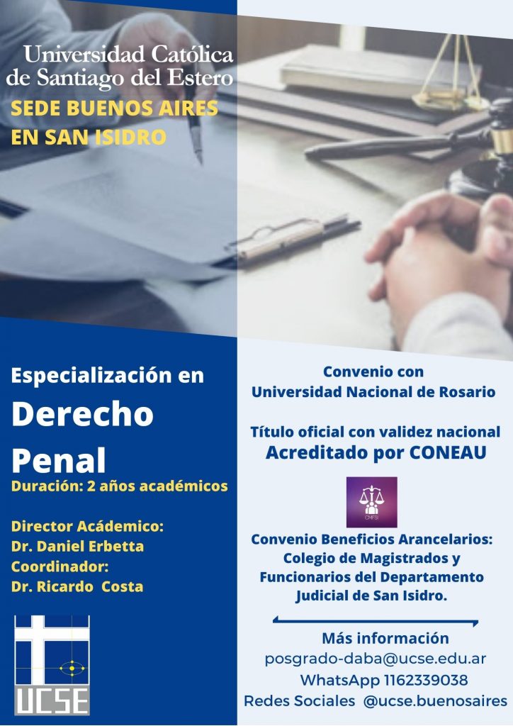 CONVENIO CON LA UNIVERSIDAD CATÓLICA DE SANTIAGO DEL ESTERO – UCSE SAN ISIDRO Este convenio permite a los colegiados y a sus familiares directos gozar de un descuento del 25% para el cursado del primer año y del 15% para el cursado del 2º año en adelante, de las carreras que formen parte da la oferta académica de la UCSE-DABA . Asimismo ofrece un descuento del 15% en las cuotas de Cursos, Seminarios, Jornadas, Especializaciones, Maestrías, Doctorados y toda otra actividad que forme parte de la oferta académica de posgrado de la UCSE-DABA.(exceptuadas las matrículas). Universidad Católica de Santiago del Estero – Departamento Académico Buenos Aires – DABA / PNA