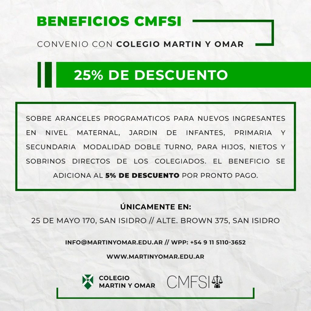 El beneficio es: 25% de descuento sobre aranceles programáticos para nuevos ingresantes en nivel maternal, jardin de infantes, primaria y secundaria modalidad doble turno, para hijos, nietos y sobrinos directos de los Colegiados. El descuento se adiciona al 5% de descuento por pronto pago.